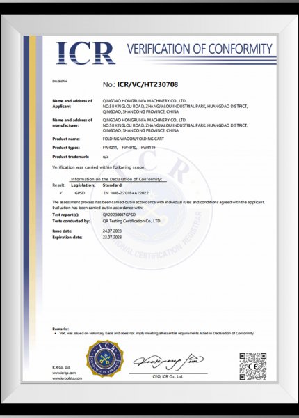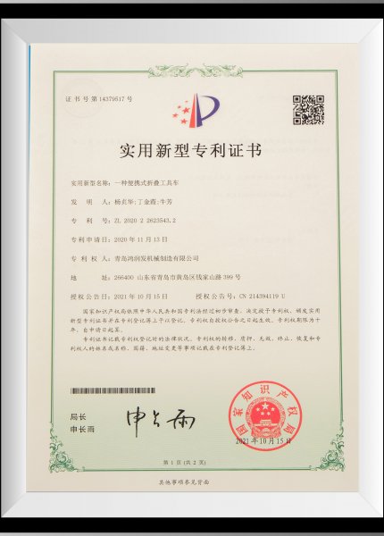 Hongrunfa is certified with BSCI, CE, and ISO 9001,and we also have numerous invention patents ensuring responsible production, product safety, and consistent quality management. Our factory also holds multiple utility and design patents for outdoor carts and related structures, demonstrating our commitment to innovation and reliable manufacturing for global B2B partners.