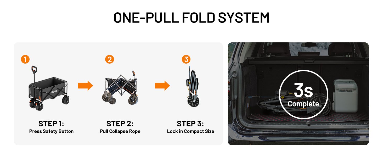 3-Second Fold & Unfold: This collapsible wagon can open and fold in just 3 seconds for quick, hassle-free use.Fits easily in your car trunk, making it especially convenient for apartment users