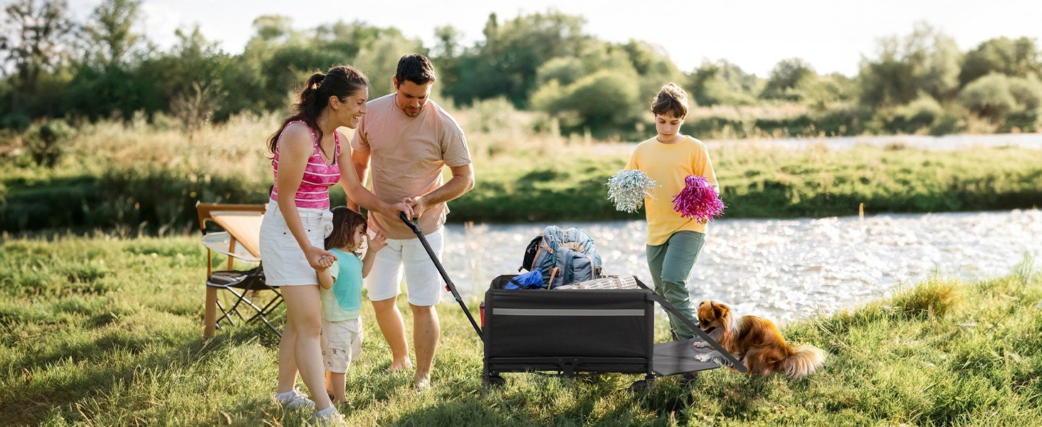 A: Absolutely. The cart features a foldable loading flap that extends up to 108 cm, making it ideal for transporting long items such as surfboards, fishing rods, or beach umbrellas. With over 120 liters of capacity, it also offers ample space for pets to get in and out comfortably.