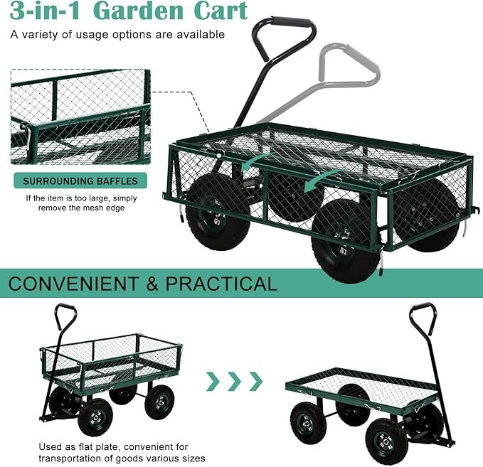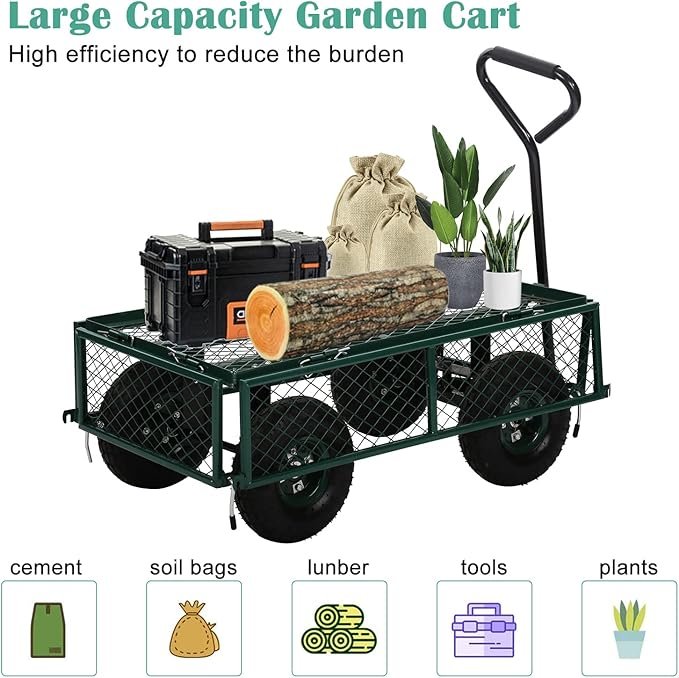 Heavy-Duty Steel Frame: Constructed from reinforced high-carbon steel, our garden cart is built to withstand years of rigorous use. The robust frame ensures exceptional longevity and unwavering sturdiness, providing reliable support for all your heaviest outdoor tasks without bending or warping.