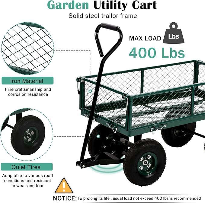 Built with a heavy-duty steel frame, the garden cart is engineered to handle heavy loads, with a large load capacity of up to 350kg/771LBS. The all-terrain wheels provide excellent mobility, making it easy to maneuver across different surfaces, from soil to gravel to grass.