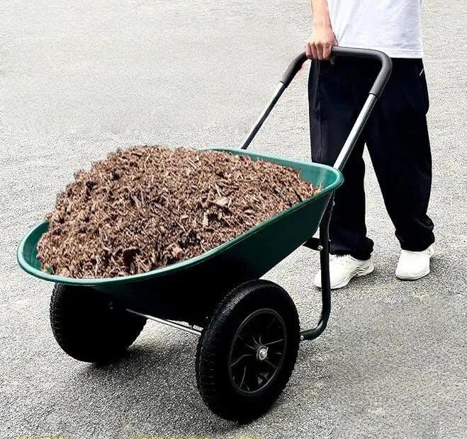 A two-wheeled truck that is useful for gardening, farming, and construction work. This product allows for easy and stable transportation of leaves, inserts, logs, sand, and various types of garbage. With a 78L capacity, super strong steel pipe and plastic tray, the motorcycle's tires are constructed with no puncture tires for a very stable and durable cart. Soft handle makes it easy to grip and operate