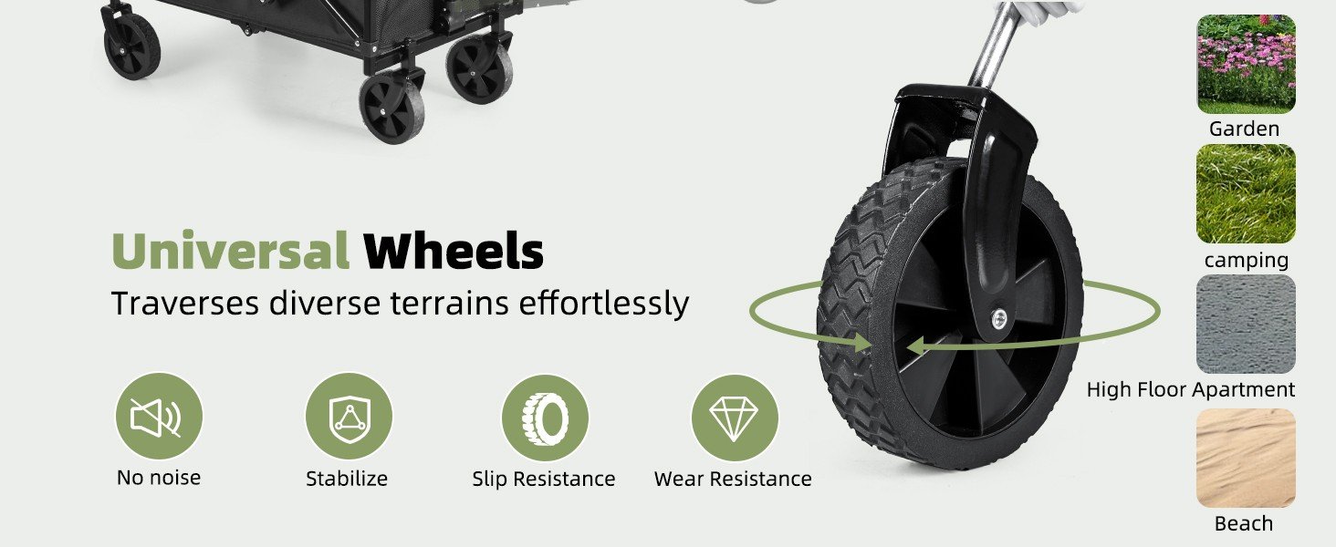 A folding wagon is only as good as its wheels. The shift from fixed wheels to 360° rotating wheels is not just a minor upgrade — it is a fundamental improvement in usability, comfort, and versatility.