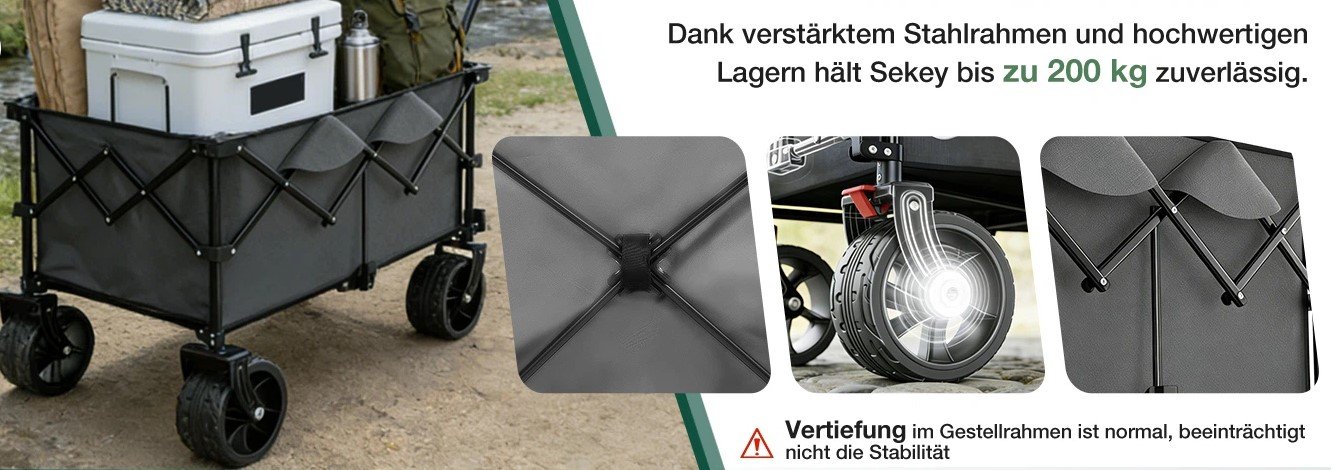 How to carry? It offers a load capacity of up to 200 °C - thanks to the robust steel frame construction and precision bearing technology. Whether drinks crates, complete camping equipment or bulk shopping, you always push it evenly and easily.